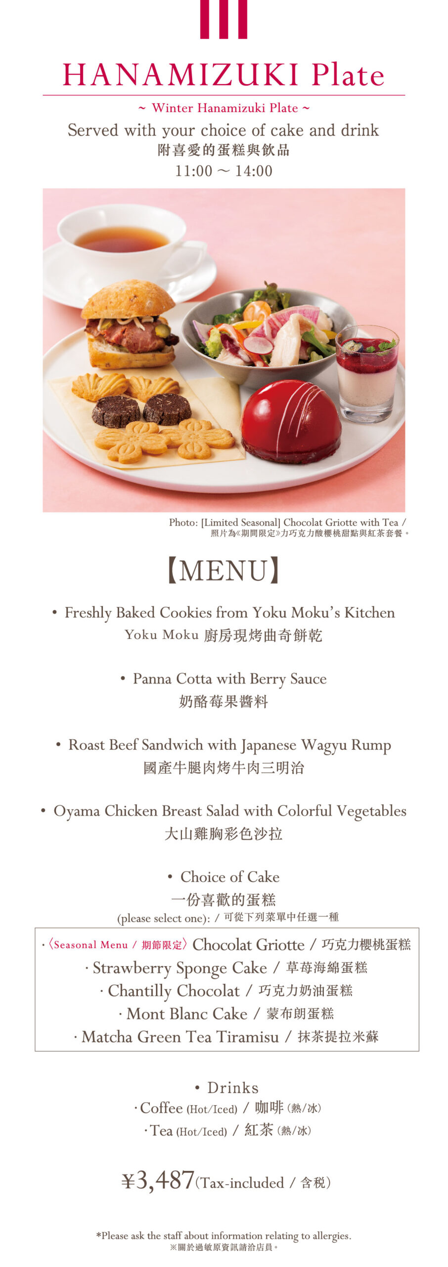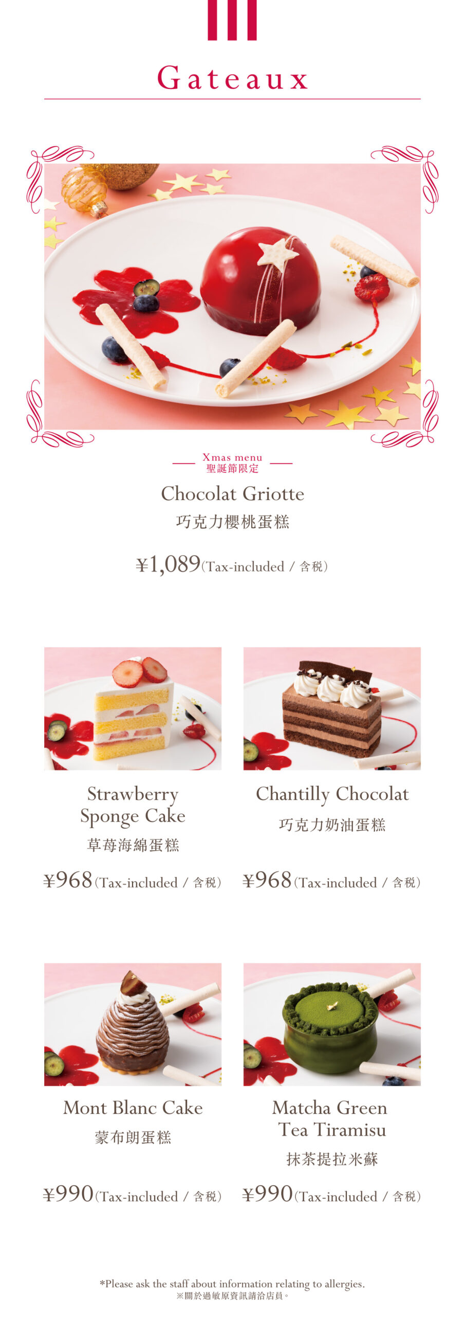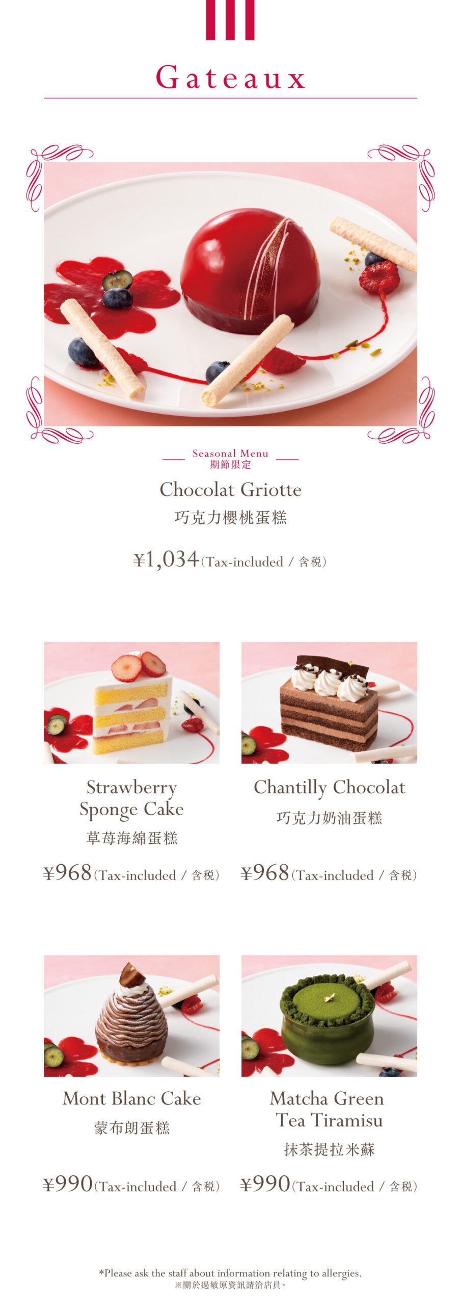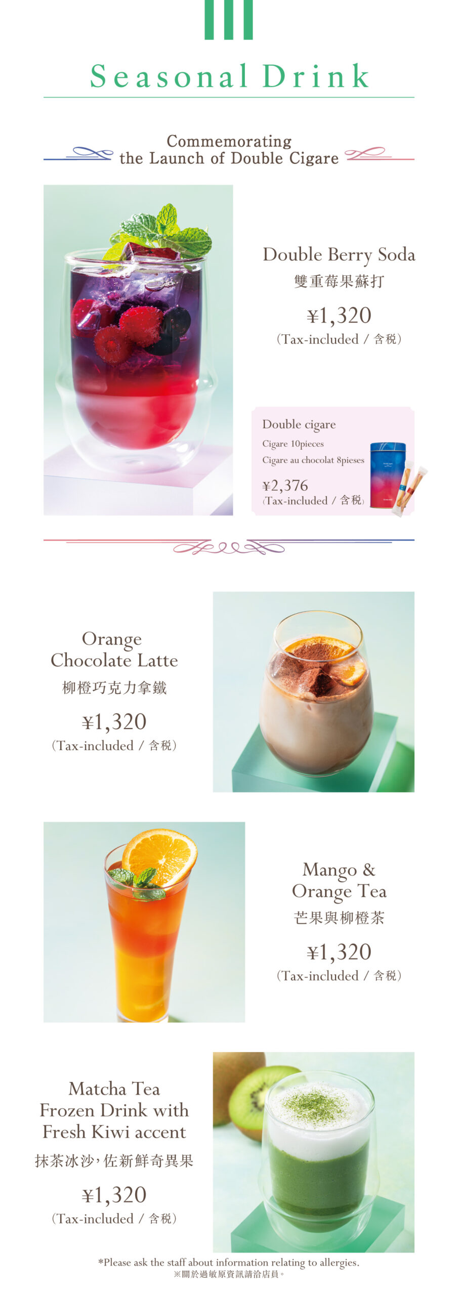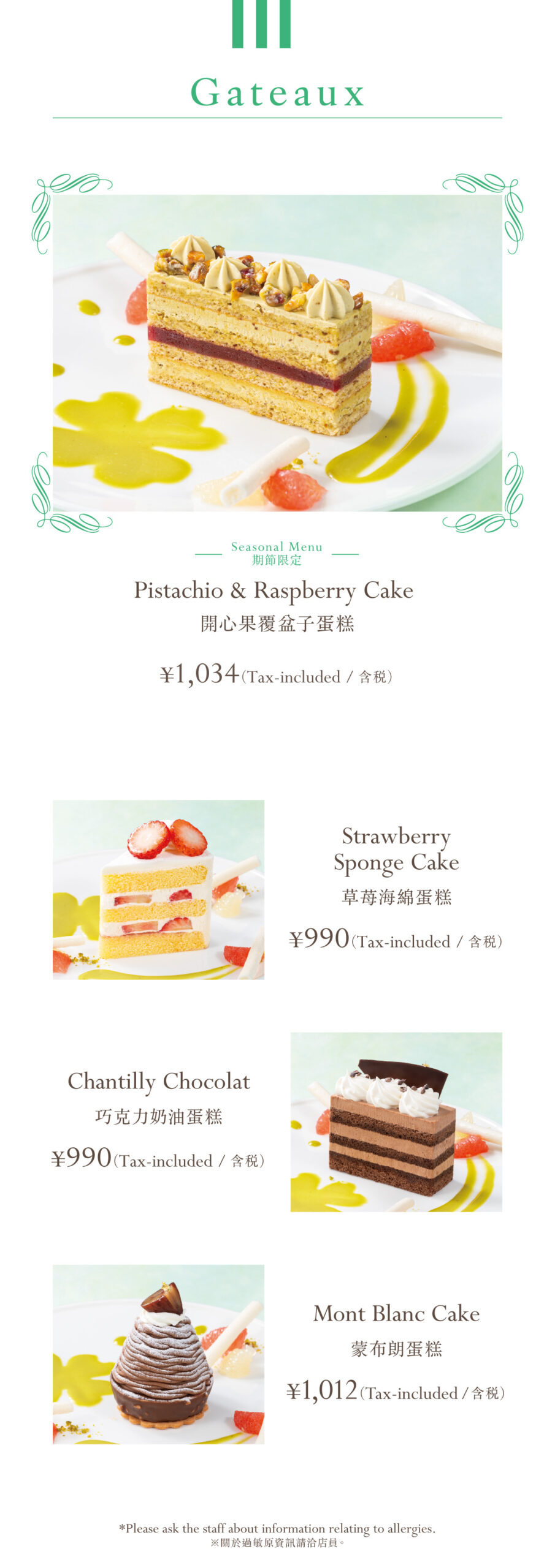 In the Aoyama Main Shop we enjoy serving customers unique and special items, such as fresh seasonal cakes and baked confectionery made from a variety of ingredients, as well as delicious dishes and desserts only available in this shop, in addition to our staple cookie products such as the popular Cigare.