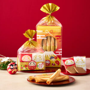 焼き上げた生地を二つ折りにして、ミルクチョコレートで包んだクッキー。パッケージは縁起物のだるまを中心に、松竹梅をあしらいました。個包装も紅白2種用意し、「開運」「招福」の文字を添え、華やかさとお正月のおめでたさを表現しています。