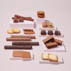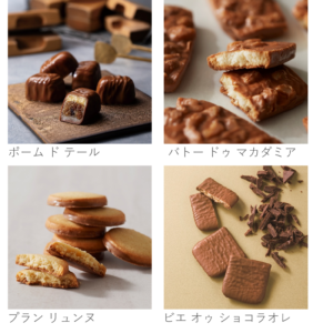この時期はショコラをまとった秋冬限定の定番ラインナップが登場!「ポーム ド テール※」は数ヶ月洋酒に漬け込んだフルーツを使ったフルーツケーキとバタークリームを、マジパンとミルクチョコレートで包んだお菓子。「バトー ドゥ マカダミア」はナッツのゴロっとした食感と、チョコレートの上品な甘さで、もう1枚、また1枚と食べたくなるおいしさです。「プラン リュンヌ」はフランス語で“満月”の意味。ホロっとした食感と、くちどけのよいチョコレートのバランスをお楽しみいただけます。「ビエ オゥ ショコラオレ」はラングドシャー生地をふたつ折りにして、ミルクチョコレートでやさしく包んだクッキーです。贈り物にも、自分へのごほうびにも。この季節にお楽しみいただきたい、多彩なラインナップをご用意しました。※アルコール分が2.8%含まれています。お酒を使用しておりますので、お子様やアルコールに弱い方、妊娠、授乳期の方、運転時などはご遠慮ください。