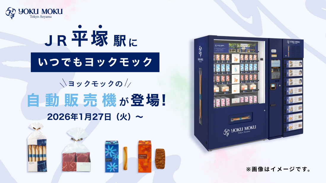 株式会社ヨックモック(本社:東京都千代田区、代表取締役:藤縄 武士)は、実店舗の営業時間外でもヨックモックの定番商品を購入できる自動販売機「いつでもヨックモック」をJR 平塚駅に設置し、2026年1月27日(火)より販売を開始します。第5弾となる今回は、1日55,000人を超える乗車人員を誇る「JR 平塚駅」の東口改札前構内へ出店。定番クッキーが食べきりサイズの紙箱に入った『 MY YOKUMOKU 』シリーズから、贈答用にもなるアソート詰め合わせまで、幅広いシーンでご利用いただけるラインナップをご用意します。駅構内という利便性で、お仕事帰りのちょっとした自分へのごほうびや、家族や知人、お世話になった方への手土産にも「いつでもヨックモック」で気軽に当社のお菓子をお楽しみください。