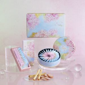 色鮮やかな青空に映える、ピンク・グリーン・ゴールドの多彩な桜が美しく舞う姿を描いたパッケージデザインです。さまざまな角度から映し出される桜の姿は、見るたびに心をふっと明るくし、春の訪れを感じさせます。変化の多いこの季節に、桜がそっと寄り添い、前向きな気持ちへと導いてくれるようなデザインへと仕上げました。新たな門出を祝う、春の特別な贈り物です。