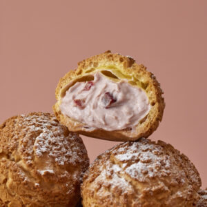 2026年2月15日(日)より「ヨックモックの手作りクッキーシュー いちご」を販売します。クッキーシューの中には、春を感じる、甘酸っぱい自家製の苺カスタードクリームがたっぷり詰まっています。苺の果肉感が出るよう、粗目にカットされたセミドライの果肉をクリームに合わせました。