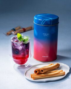 ヨックモックの“新定番”「ドゥーブル シガール」発売を記念して、ヨックモック青山本店の『ブルー・ブリック・ラウンジ』では「ドゥーブルベリーのソーダ」を、2026年4月15日(水)~6月14日(日)の期間限定で販売します。