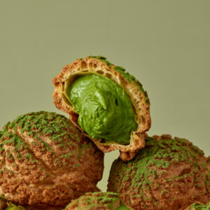初夏の味わい「シガール オゥ マッチャ」と同じ「宇治抹茶」を使用した抹茶のクッキーシュー。使用している宇治抹茶は茶師が数種類の茶葉から厳選したオリジナルブレンドです。宇治抹茶の香りと旨み、そして抹茶本来の味わいを十分にお楽しみいただけます。旨味や香りが引き立つ宇治抹茶を合わせた自家製の宇治抹茶カスタードクリームがたっぷりと詰まっており、やさしいバニラの風味が抹茶の味わいを引き立たせます。「シガール オゥ マッチャ」とともに、ヨックモックの抹茶シリーズで初夏の季節をお楽しみください。