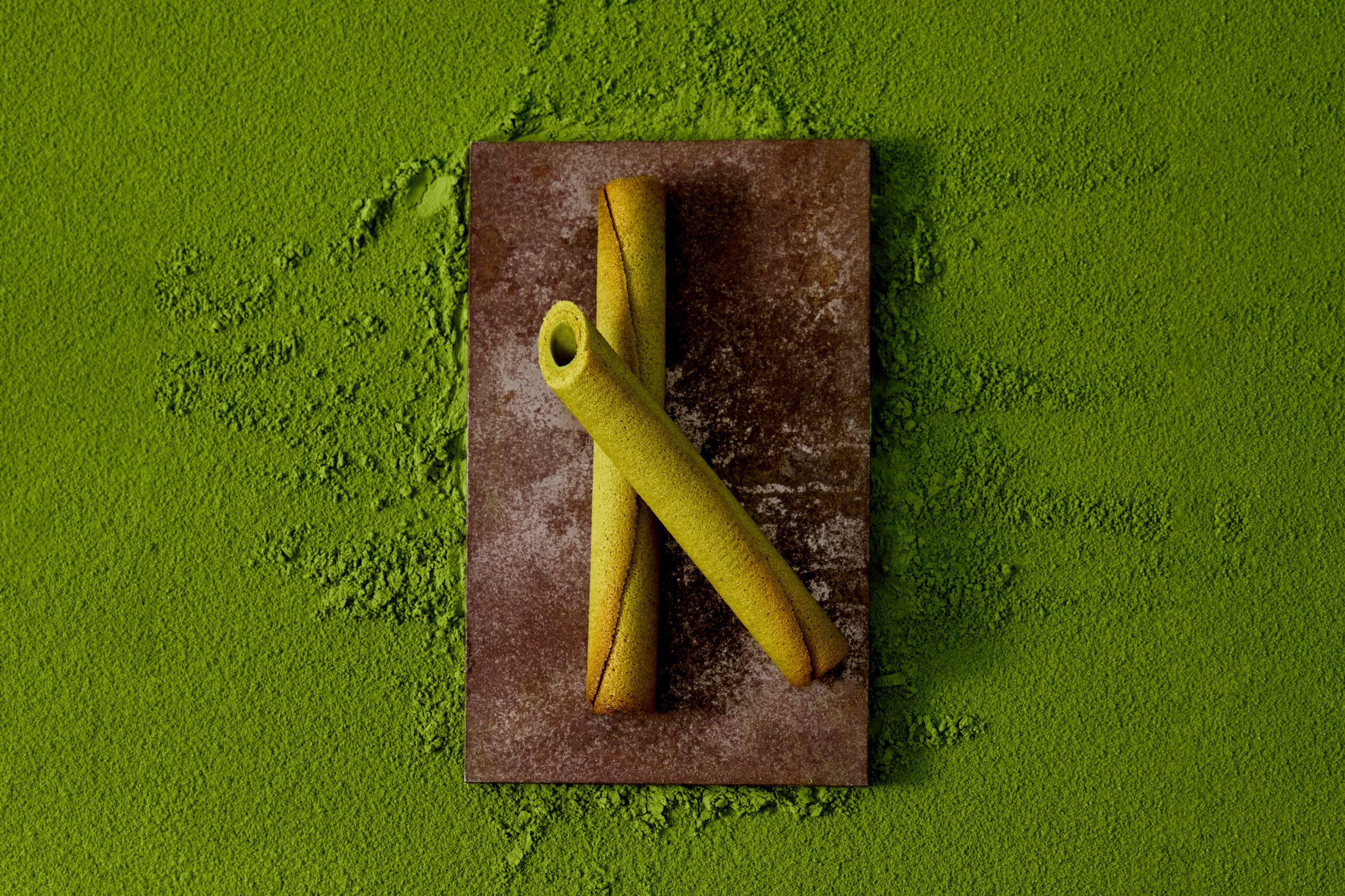 くるっと巻いた抹茶生地のシガールに抹茶のチョコレートを詰めました。宇治抹茶の甘みと旨みがバターの豊かな風味と融合し、それぞれが引き立つ絶妙な配合バランスに仕立てました。