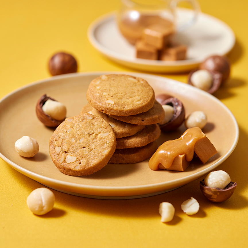 やさしい甘みのキャラメルと、香ばしいマカダミアナッツを組合せて焼き上げたクッキーです。