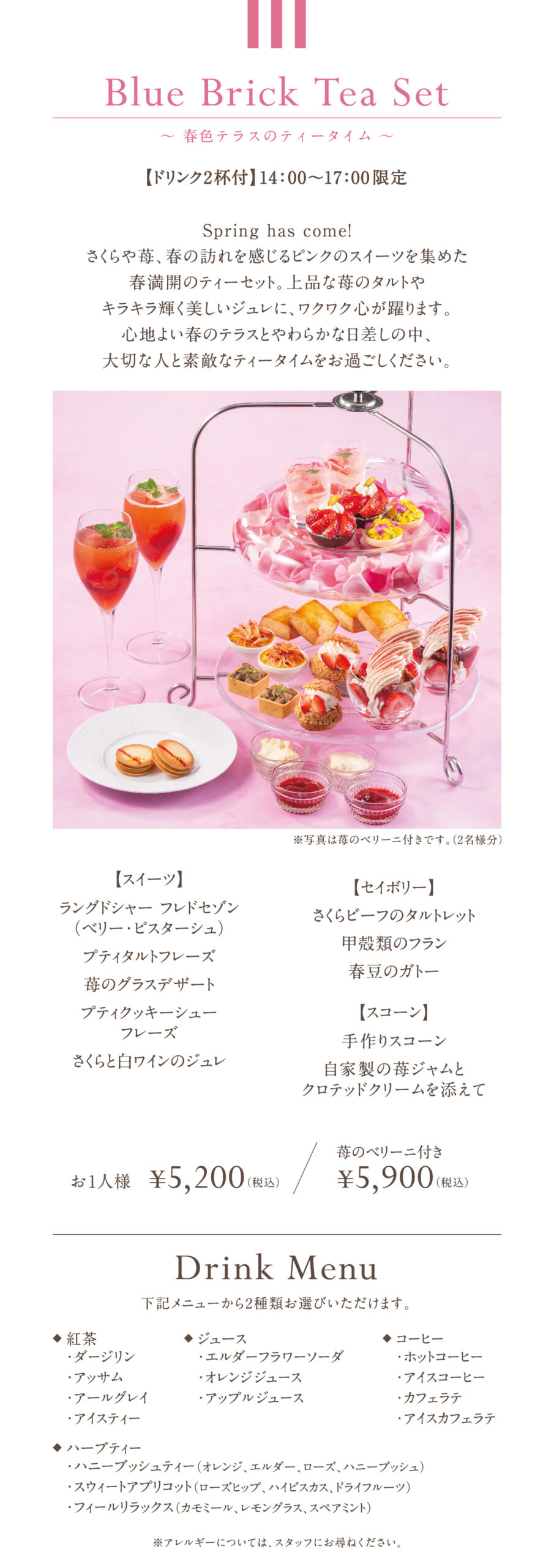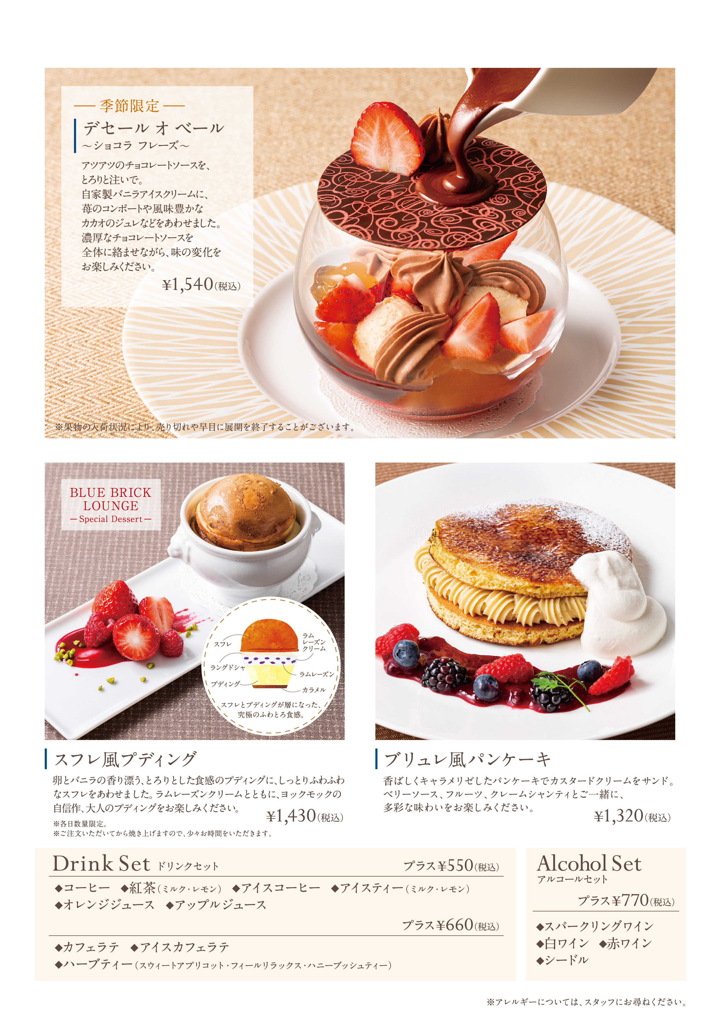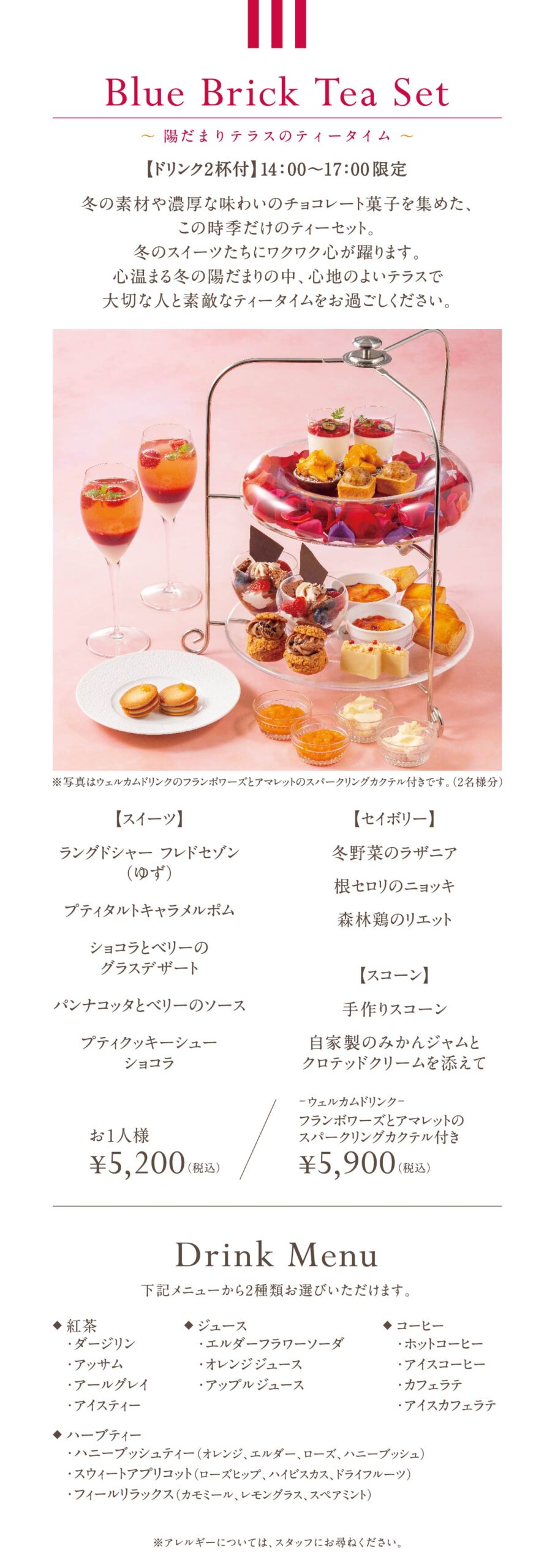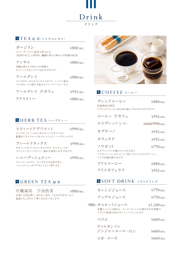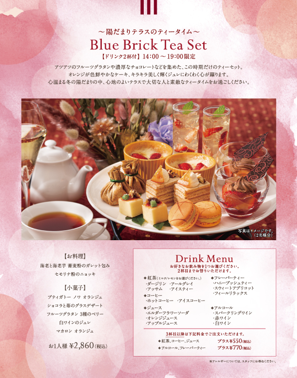 BLUE BRICK LOUNGEブルー・ブリック・ラウンジゆったりとした店内と、ウッドデッキが心地よいオープンエアのテラス席。季節ごとに変化する限定のオリジナルケーキなどをご用意して、皆様の素敵なアフタヌーンティーを演出します。